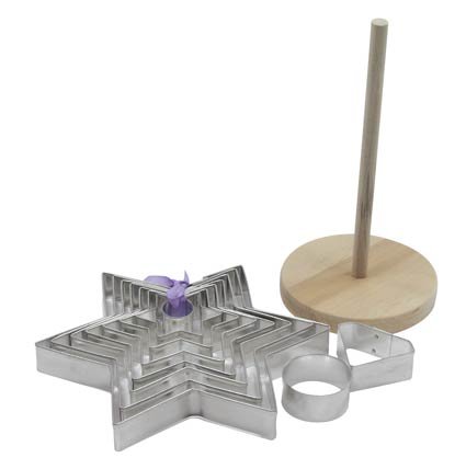 Sada vykrajovátek na výrobu stromečku + dřevěný stojánek na který vykrájené a upečené dílky nandáme a vznikne nám tak stromeček s ozdobou navrchu. 10 kusů vykrajovátek v balení. Materiál - pocínovaný plech. Vykrajovátka nejsou vhodná do myčky nádobí. Rozměry - výška hotového stromečku by měla být 16 cm, spodní průměr 13,5 cm.