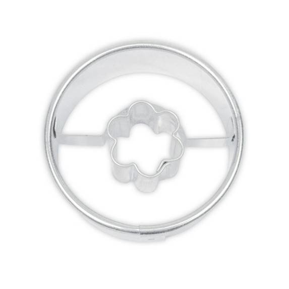 Vykrajovátko na cukroví ve tvaru kolečka průměrem 4 cm a květem uprostřed. číst celé