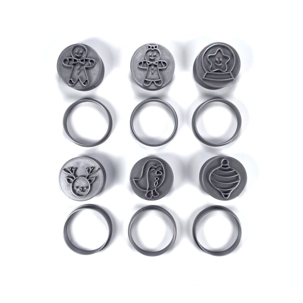 Plastová razítka vyrábíme inovativním 3D tiskem, z plastového materiálu PLA (materiál biologicky odbouratelný), odolný do 50°C a nevhodný do myčky na nádobí. Tvořítka jsou složena ze dvou částí: ostrý obvodový kruh vykrojí těsto a razítko s obrázkem detailně přenese konkrétní motiv do hmoty. Mezi hmoty hodící se pro tvoření s razítky patří sladká těsta na sušenky či linecké cukroví, ale i polotuhé hmoty jako fondán, marcipán, plastelína, Play-Doh, Modurit, keramická hlína, Fimo apod. Před prvním použitím a vždy po použití razítka omyjte jarovou vodou a důkladně osušte. Pro snazší práci s těsty je vhodné razítka nejprve vložit do misky s moukou. Nejsou určena pro děti do 3 let, hrozí odlomení malých částí.