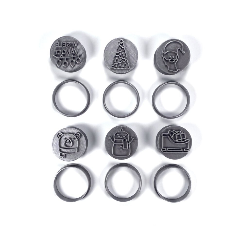 Plastová razítka vyrábíme inovativním 3D tiskem, z plastového materiálu PLA (materiál biologicky odbouratelný), odolný do 50°C a nevhodný do myčky na nádobí. Tvořítka jsou složena ze dvou částí: ostrý obvodový kruh vykrojí těsto a razítko s obrázkem detailně přenese konkrétní motiv do hmoty. Mezi hmoty hodící se pro tvoření s razítky patří sladká těsta na sušenky či linecké cukroví, ale i polotuhé hmoty jako fondán, marcipán, plastelína, Play-Doh, Modurit, keramická hlína, Fimo apod. Před prvním použitím a vždy po použití razítka omyjte jarovou vodou a důkladně osušte. Pro snazší práci s těsty je vhodné razítka nejprve vložit do misky s moukou. Nejsou určena pro děti do 3 let, hrozí odlomení malých částí.