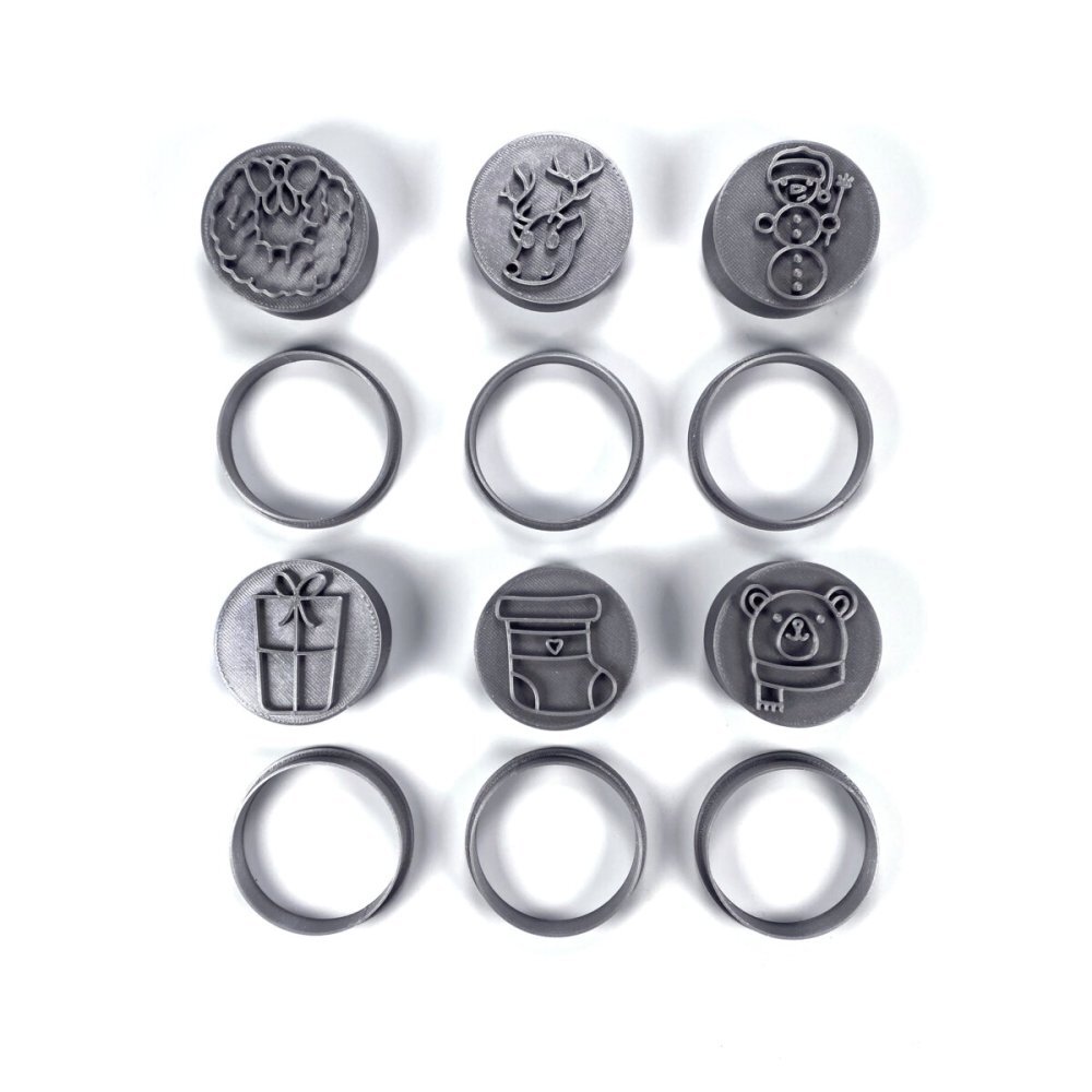 Plastová razítka vyrábíme inovativním 3D tiskem, z plastového materiálu PLA (materiál biologicky odbouratelný), odolný do 50°C a nevhodný do myčky na nádobí. Tvořítka jsou složena ze dvou částí: ostrý obvodový kruh vykrojí těsto a razítko s obrázkem detailně přenese konkrétní motiv do hmoty. Mezi hmoty hodící se pro tvoření s razítky patří sladká těsta na sušenky či linecké cukroví, ale i polotuhé hmoty jako fondán, marcipán, plastelína, Play-Doh, Modurit, keramická hlína, Fimo apod. Před prvním použitím a vždy po použití razítka omyjte jarovou vodou a důkladně osušte. Pro snazší práci s těsty je vhodné razítka nejprve vložit do misky s moukou. Nejsou určena pro děti do 3 let, hrozí odlomení malých částí.