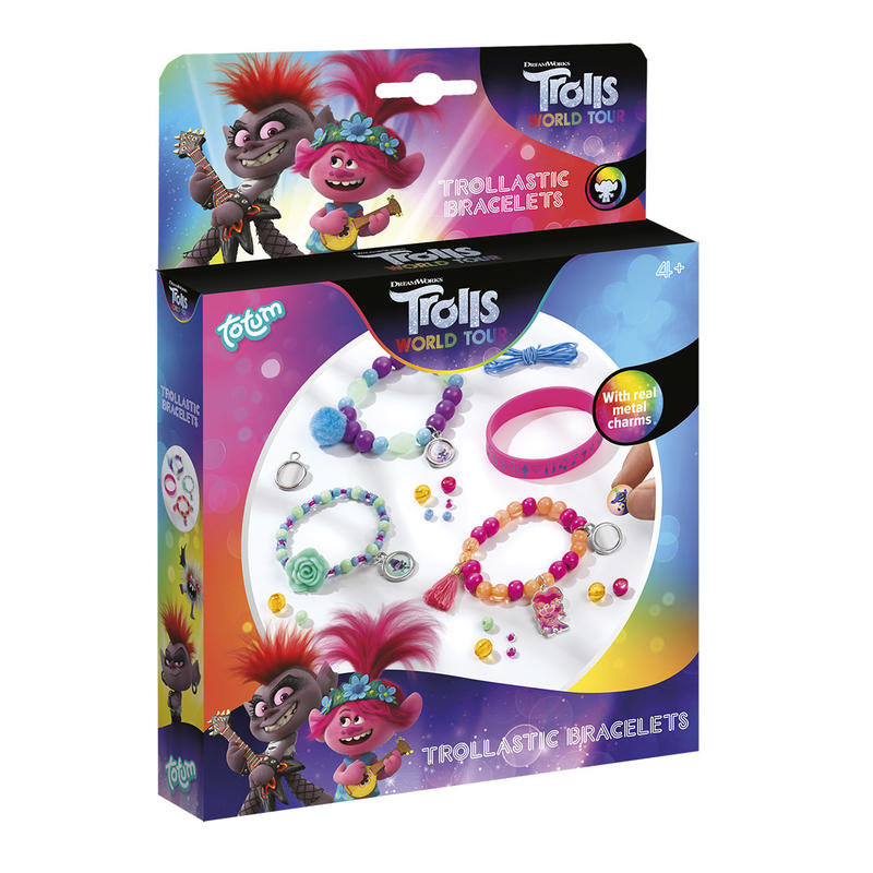 Trollové - vyrob si tři různé korálkové náramky.Vynikající hračka pro rozvoj manuální zručnosti. Vše potřebné k výrobě najdete uvnitř balení.Balení obsahuje: kovový přívěšek s 3D nálepkou, různé barevné korálky, bambulku, střapec, 3 kovové talismany, 3D transparetní samolepky, nálepku, elastickou nit, silikonový náramek, kovový prsten, návod k použití.Rozměry balení: 24,5 x 17,5 x 3,5 cm.Doporučeno pro děti od 4 let.