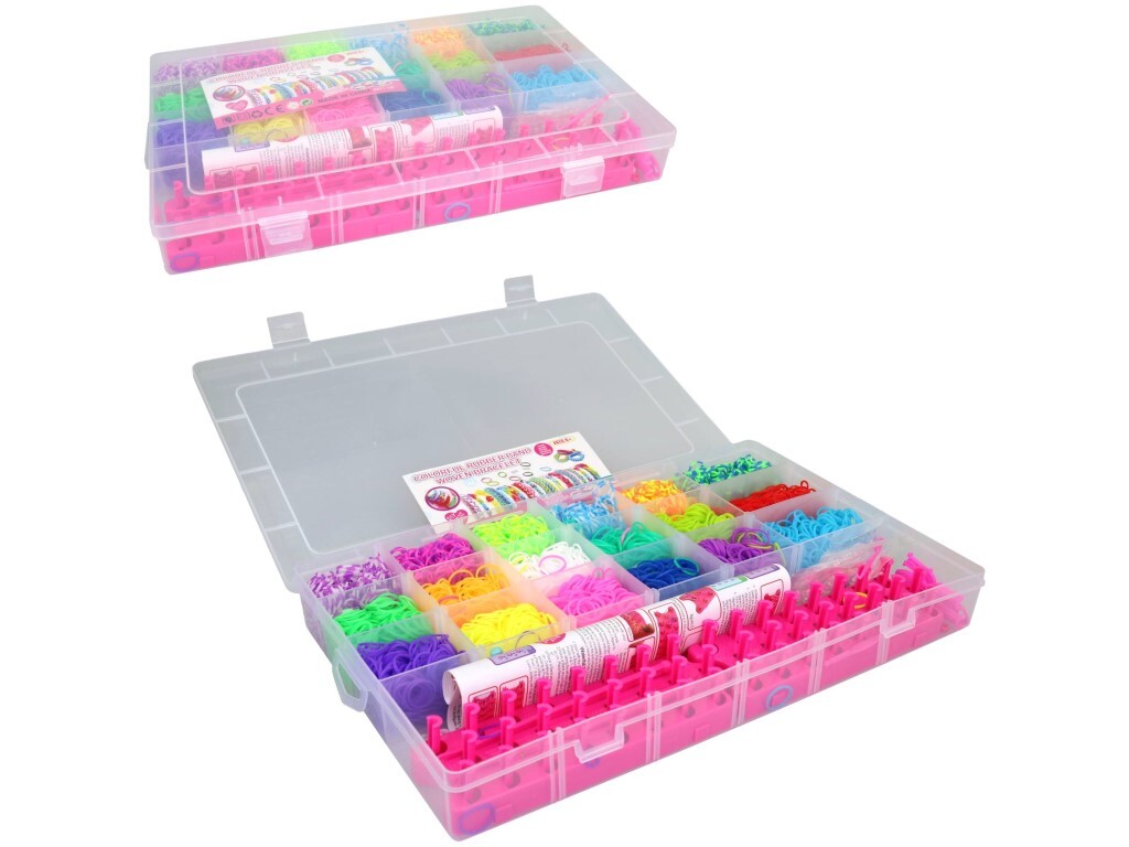 Sestava gumiček s pletacím stojanem. Jedno velké potěšení pro kreativní duše v jednom praktickém balení s 18 přihrádkami. Transparentní pouzdro umožňuje vidět, kde jsou jednotlivé barvy a přihrádky chrání před zamícháním gumiček. Široká škála zářivých a výrazných barev vybízí ke hře a tvoření. Sada je určena k výrobě náramků, figurek, prstýnků a různých přívěšků prostě vše co vás napadne. Předveď své tvůrčí dovednosti.Hračka je určena pro děti 3+. Rozměr hračky je 35 x 22 x 5 cm. Materiál hračky je plast. Balení hračky je box. Produkt je určený pro holky.