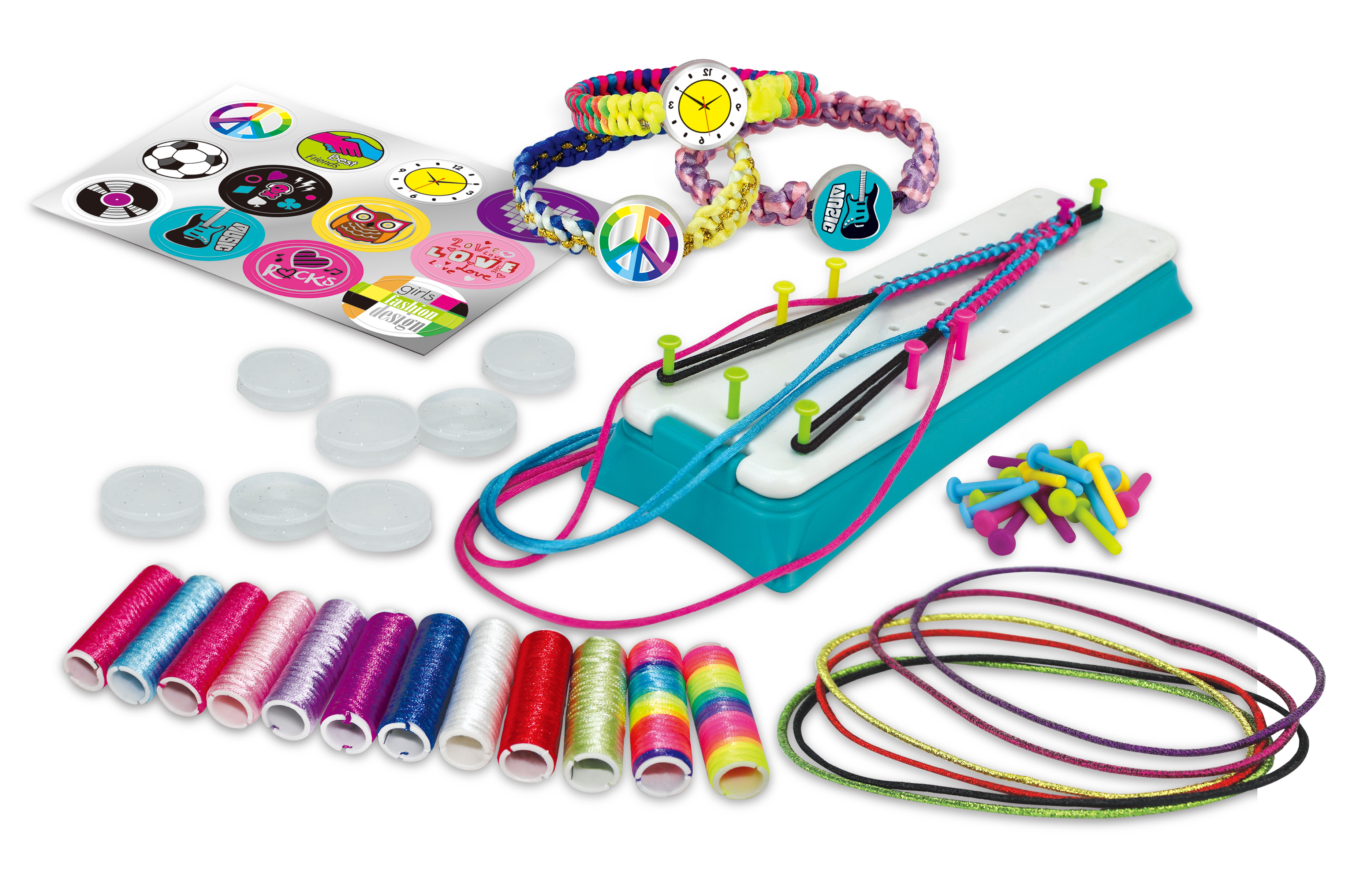 Zaplétání náramků s ozdobami. Tvorba až 12 náramků Možnost použít 7 stylů uzlů Obsah balení: zaplétací nástroj 12 barevných provázků 12 ozdob návod Doporučený věk. od 6 let