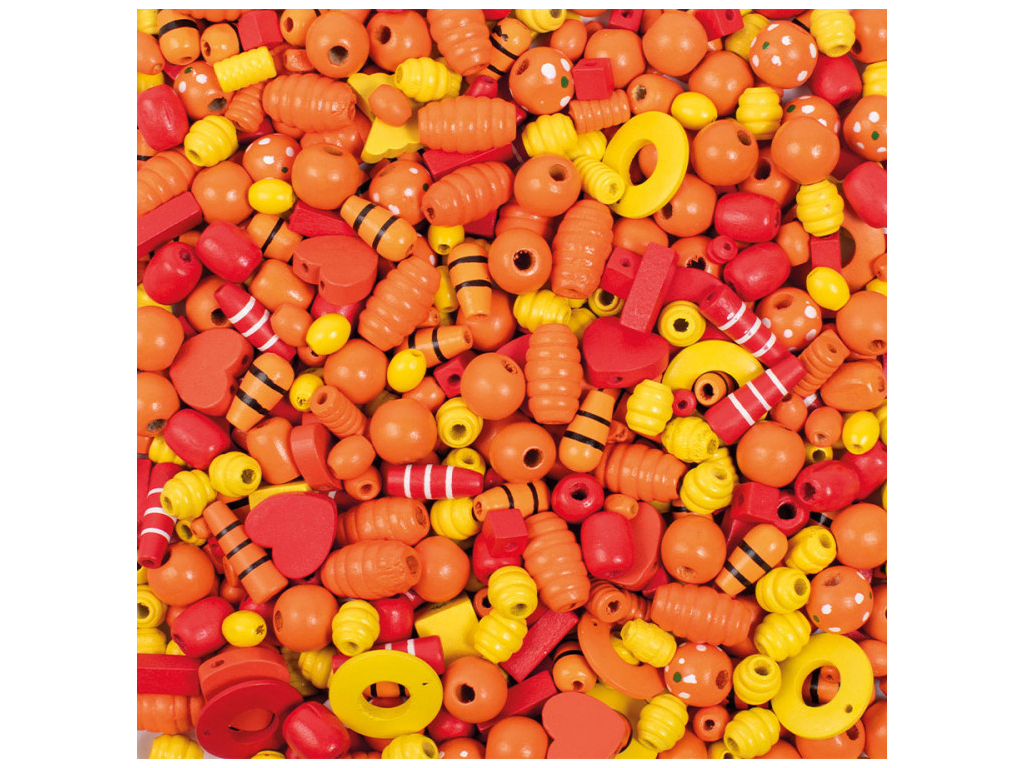 Balení obsahuje cca 1000 ks dřevěných korálků v různých tvarech a barvách - oranžové, žluté, červené o Ø 8-25 mm s Ø průvleku 2,4-4 mm.
