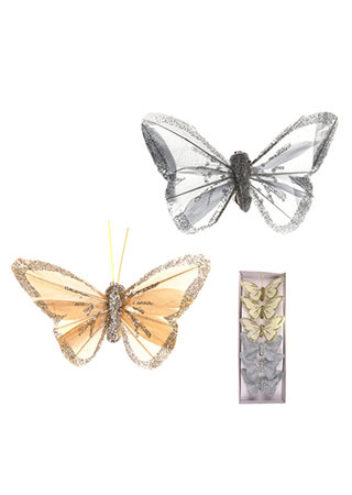 Motýl s klipem, 6ks v krabičce, barva krémová a šedá s glitry, cena za 1 krabičk