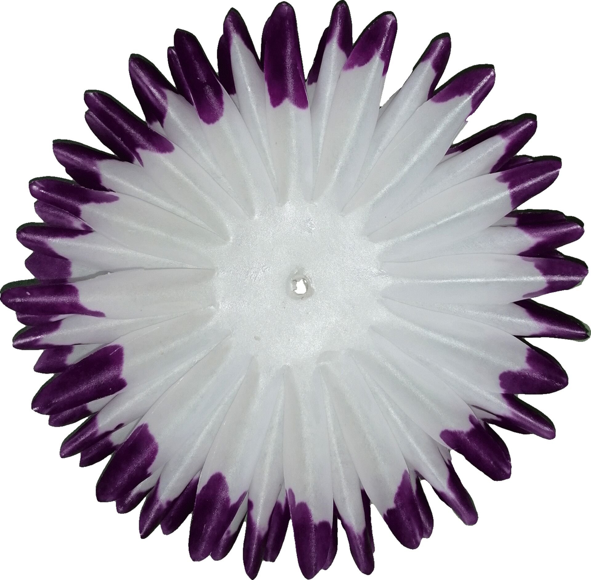 Samostatný lístek z voskovaného papíru pro výrobu květů na smuteční věnce a kytice. Barva: zelený střed -bílá - fialové špičky Rozměr: 13 cm