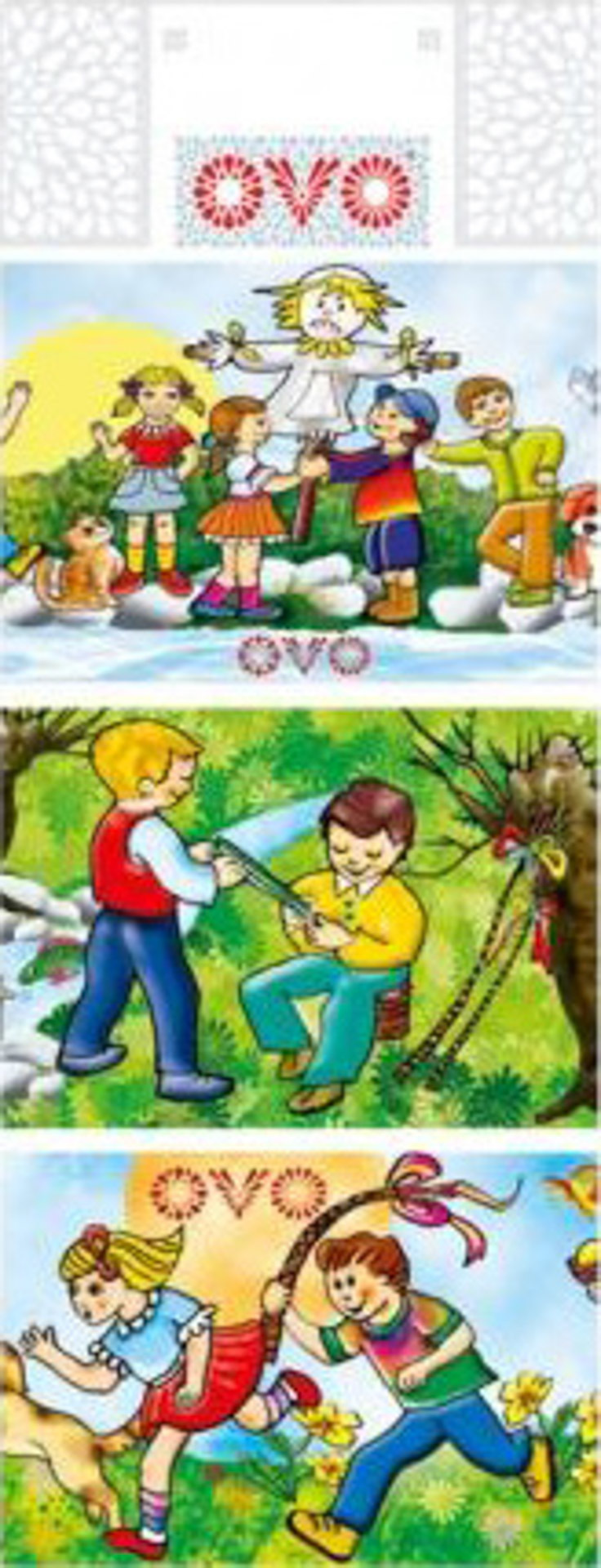 Smršťovací fólie s kresbou na velikonoční vajíčka ve stylu obrázků tradičních českých zvyků a obyčejů.
