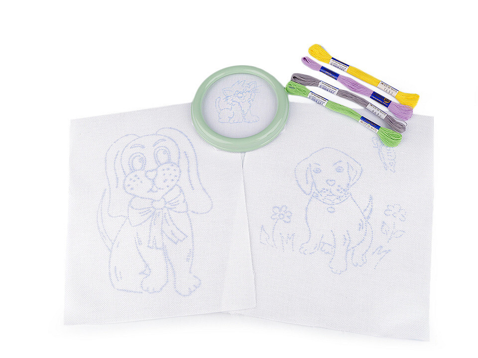 Zabavte vaše šikovné děti vyšíváním. Souprava dětského vyšívání obsahuje kulatý rámeček s látkou, která má předtištěný vzor, 4 kvalitní vyšívací příze mouline ze 100% bavlny a dvě větší plátna (23 x 26 cm) s předtištěnými motivy.