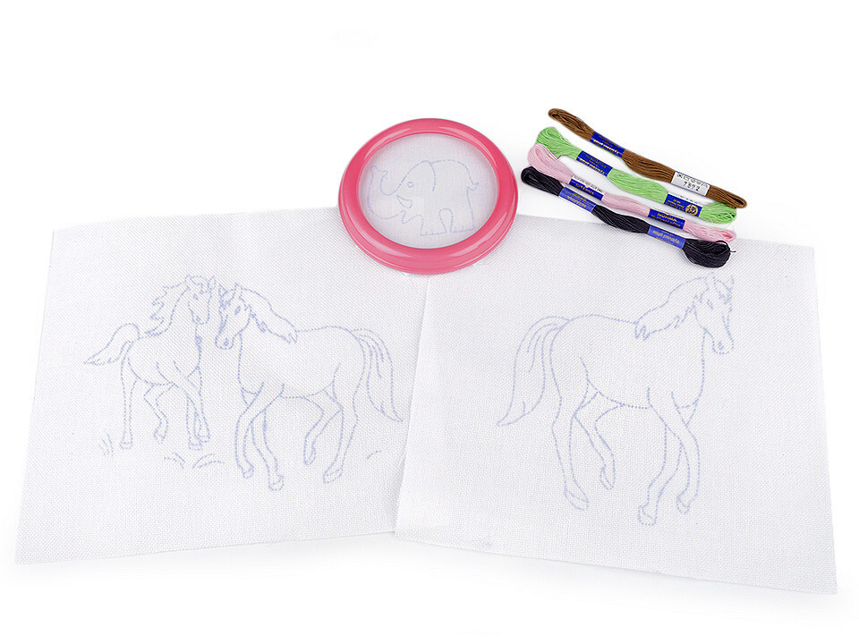 Zabavte vaše šikovné děti vyšíváním. Souprava dětského vyšívání obsahuje kulatý rámeček s látkou, která má předtištěný vzor, 4 kvalitní vyšívací příze mouline ze 100% bavlny a dvě větší plátna (23 x 26 cm) s předtištěnými motivy.