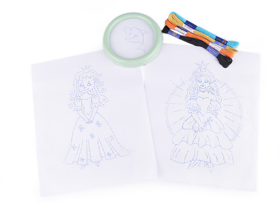 Zabavte vaše šikovné děti vyšíváním. Souprava dětského vyšívání obsahuje kulatý rámeček s látkou, která má předtištěný vzor, 4 kvalitní vyšívací příze mouline ze 100% bavlny a dvě větší plátna (23 x 26 cm) s předtištěnými motivy.