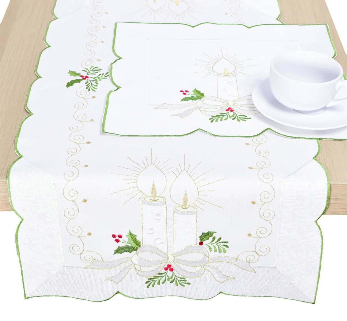 Ubrusy jsou vyrobeny z kvalitní tkaniny, která dodává elegantní vzhled. Jemný motiv svíce a jmelí přidává nádech luxusu, zatímco zelený lem podtrhuje jeho sofistikovaný design.