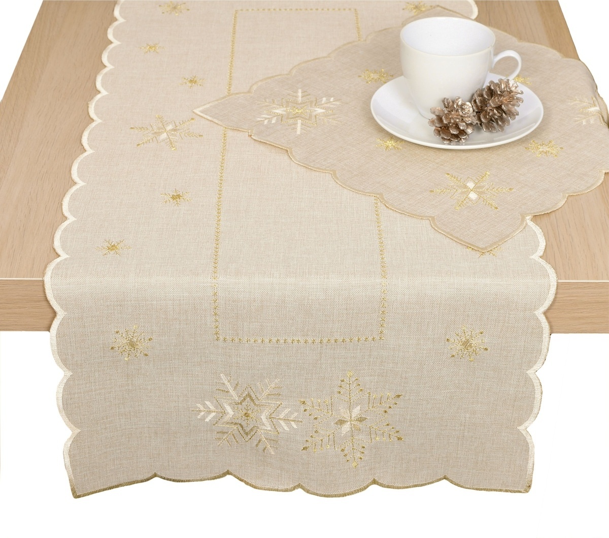 Ubrusy jsou vyrobeny z kvalitní žíhané béžové tkaniny, která dodává přírodní a teplý vzhled. Jemný zlatě krémový motiv vloček přidává nádech luxusu a elegance, zatímco krémový lem podtrhuje jeho sofistikovaný design.