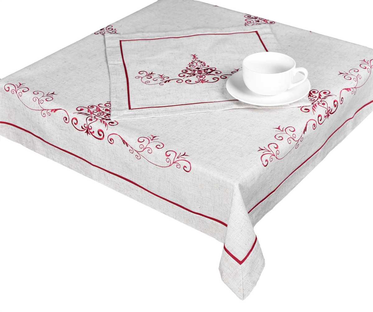 Ubrus je vyrobený z praktického 100% polyesteru a proto je údržba velice snadná. Režný, přírodní vzhled materiálu spolu s ozdobným okrajem bude tou pravou ozdobou vánočního stolu.