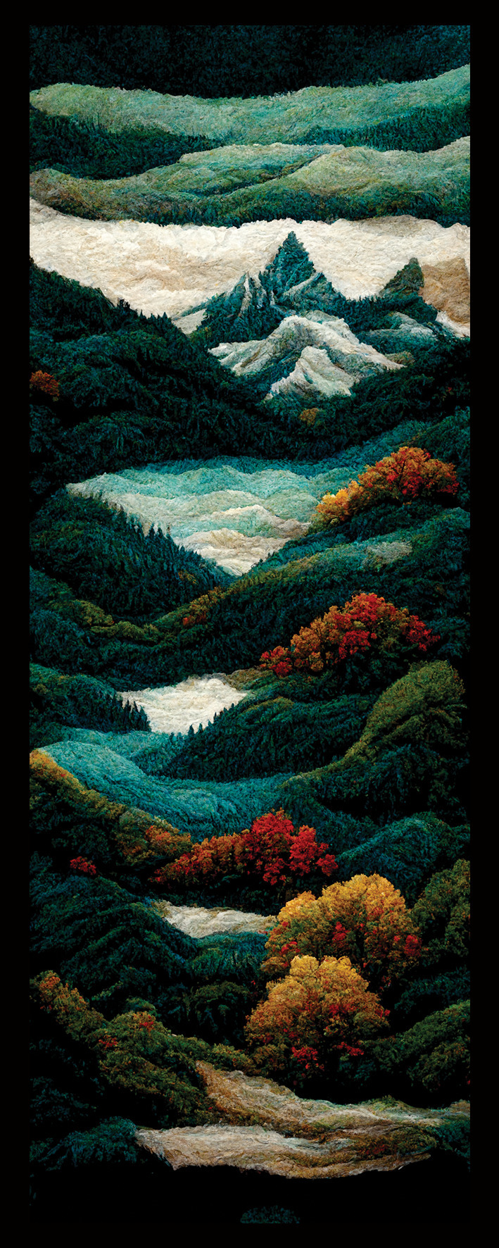 Tato záložka zobrazuje zvlněné kopce, husté koruny stromů a kontrast tmavých jehličnanů s podzimním listím, a připomene vám krásu přírody pokaždé, když knihu otevřete. Ať už čtete poezii, román, nebo povídky, tato záložka vás doprovodí a zpříjemní každý okamžik strávený s knihou.