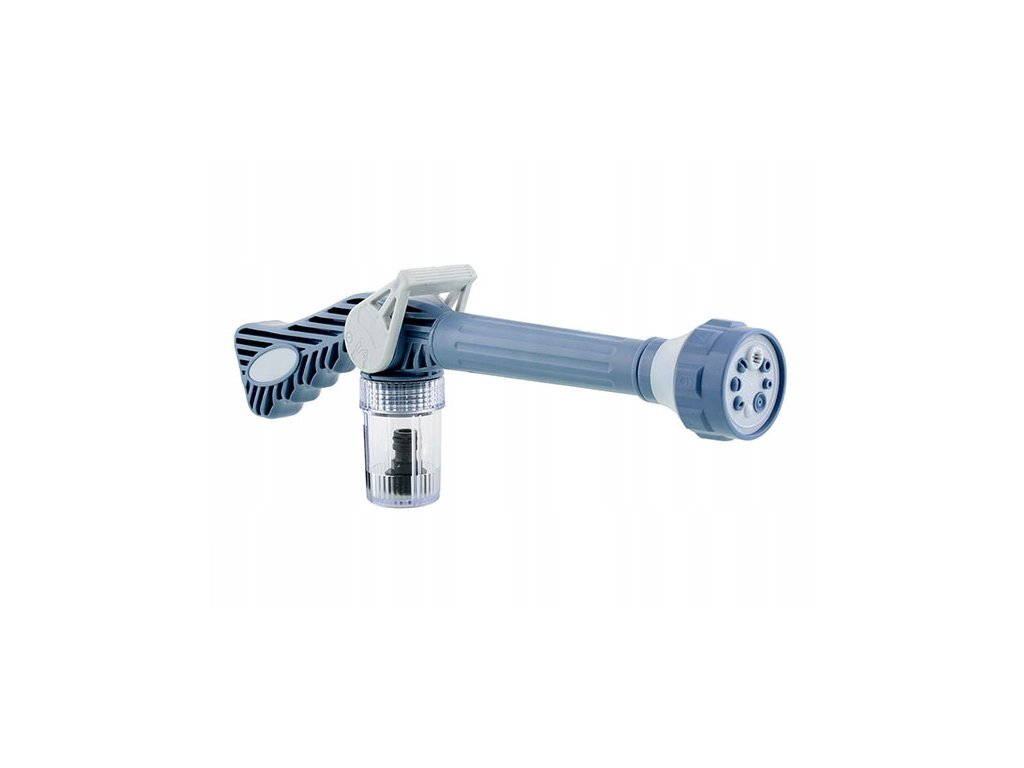 Tato unikátní tlaková pistole kombinuje výhody a sílu vysokotlakových čistících přístrojů s pohodlností a dostupností zahradních hadic. Pistoli lze snadno připevnit k jakékoliv zahradní hadici a vytvořit si tak snadno a jednoduše tlakový čistící přístroj na bázi wapky. Vodní trysku je možné nastavit na 8 různých módů, které zahrnují silný tlak, mlhu, sprchu nebo různé úhly střiku a další. Naprosto unikátní je pak vestavěný dávkovač saponátu, použitelný pro všechny typy tekutých mýdel, čisticích prostředků či vosků. Jednoduché ovládání v podobě páčky Vám umožní podle potřeby buď dávkovat saponát, vytvořit pěnu či dávkovač zcela vypnout a používat pouze vodní tlak.