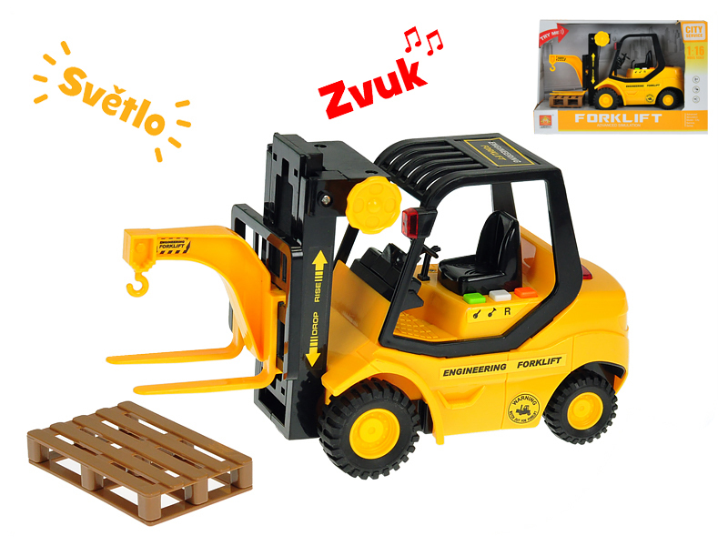 Vysokozdvižný vozík 23cm 1:16 na setrvačník na baterie se světlem a zvukem v krabičce