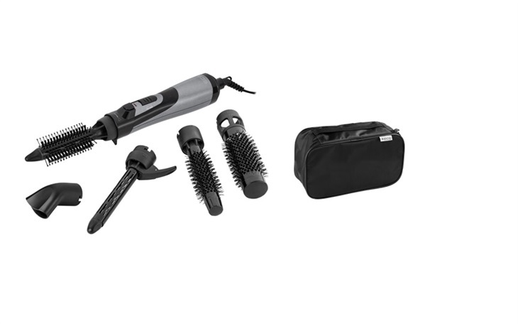 2 stupně výkonu a teploty, 5 odnímatelných nástavců: kulmovací kleště, horkovzdušný kovový kartáč, kulatý štětinový kartáč, tvarovací kartáč, hubice, příkon 1000 W, obal na nástavce a přístroj