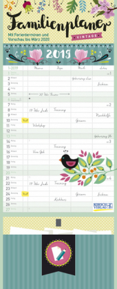 Produktmerkmale Übersichtlicher Familienplaner für bis zu 4 Personen; sehr stabile Rückwand Praktische Zusatzspalte für Ferien, Müll und weitere Aktivitäten Terminplaner ohne störende Bilder in den Spalten; Viel Platz für Eintragungen, leichte Beschreibbarkeit, auch mit Bunt- und Bleistiften Deutsches Kalendarium mit regionalen Feiertagen für Deutschland, Österreich und Schweiz Gedruckt auf umweltfreundlichem Papier Korsch Familienplaner Vintage - Großer Jahresplaner 2019 für Familien, WGs und Co Dekorativer Familientimer im angesagten Vintage-Stil - mit vielen Details liebevoll gestaltet von Mo Büdinger. Mit vier Spalten zum Eintragen von Geburtstagen, Terminen und Erinnerungen bietet der Planer viel Platz für Notizen. Damit ist es auch möglich mehrere Termine in einen Tag zu schreiben. Der Organisation des Alltags von großen und kleinen Familien steht somit nix mehr im Weg. Neben dem gesamten Kalenderjahr für 2019 enthält der Wandplaner auch eine Vorschau für Januar bis März 2020. Weitere Informationen wie Mondphasen, Ferientermine und Feiertage (auch regionale) sowie deutlich lesbare Kalenderwochen runden den Kalender ab und sorgen für einen vollständigen Überblick Ihres Jahres 2019.