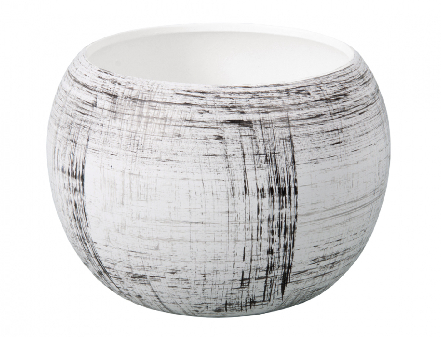 Keramický kulatý obal na rostliny s bílým matným základem a vodorovně i horizontálně nepravidelnými černými a šedými matnými čárami. Rozměr: hrdlo d 13 cm, šířka d 19 cm, základna d 10,5 cm, výška 13 cm. Barva: bílá matná s černým žíháním. číst celé