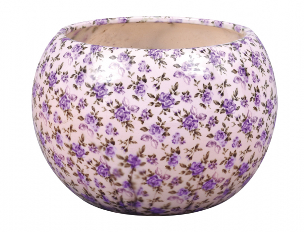 Světle béžový keramický glazovaný lesklý obal vhodný pro květníky s rostlinami. Na béžovém podkladu jsou drobné světle růžovo-fialové růžičky s tmavě zelenými lístky umístěnými po celém obalu. Obal má tvar nedotažené koule o průměru otvoru pro květníky 11cm. Celkové rozměry obalu: d. 14 x v. 10,5 cm. Používá se v interiérech.