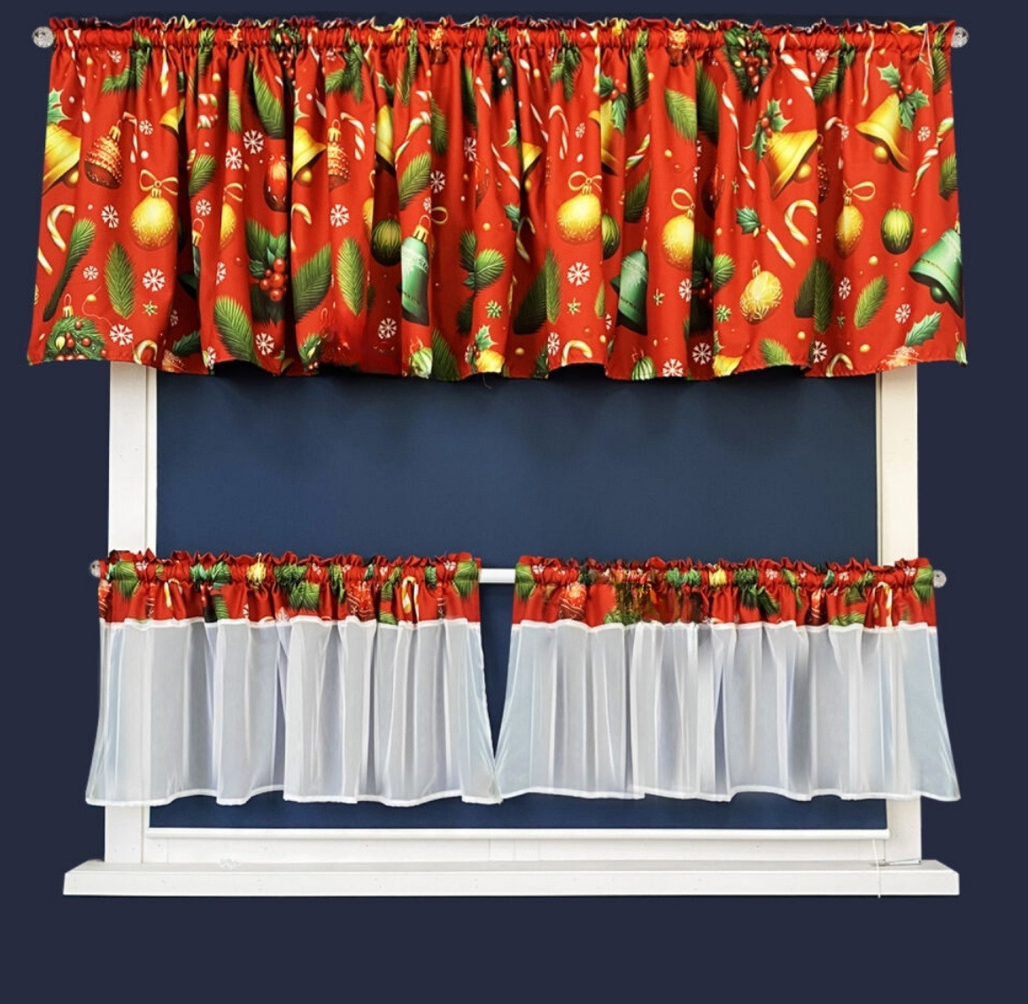 Kvalitní krátký vánoční dekorační závěs s řasící páskou v celkové šířce 400 cm a výšce 65 cm + dekorační voálové záclony s horním zdobením - 2 kusy v rozměru 180 cm x 45 cm. Set se skládá z 1 kusu závěsu a 2 kusů zdobené voálové záclony. Závěs a záclony mají našitou řasící pásku s tunýlkem pro zavěšení na tenčí garnyž, žabky nebo háčky.