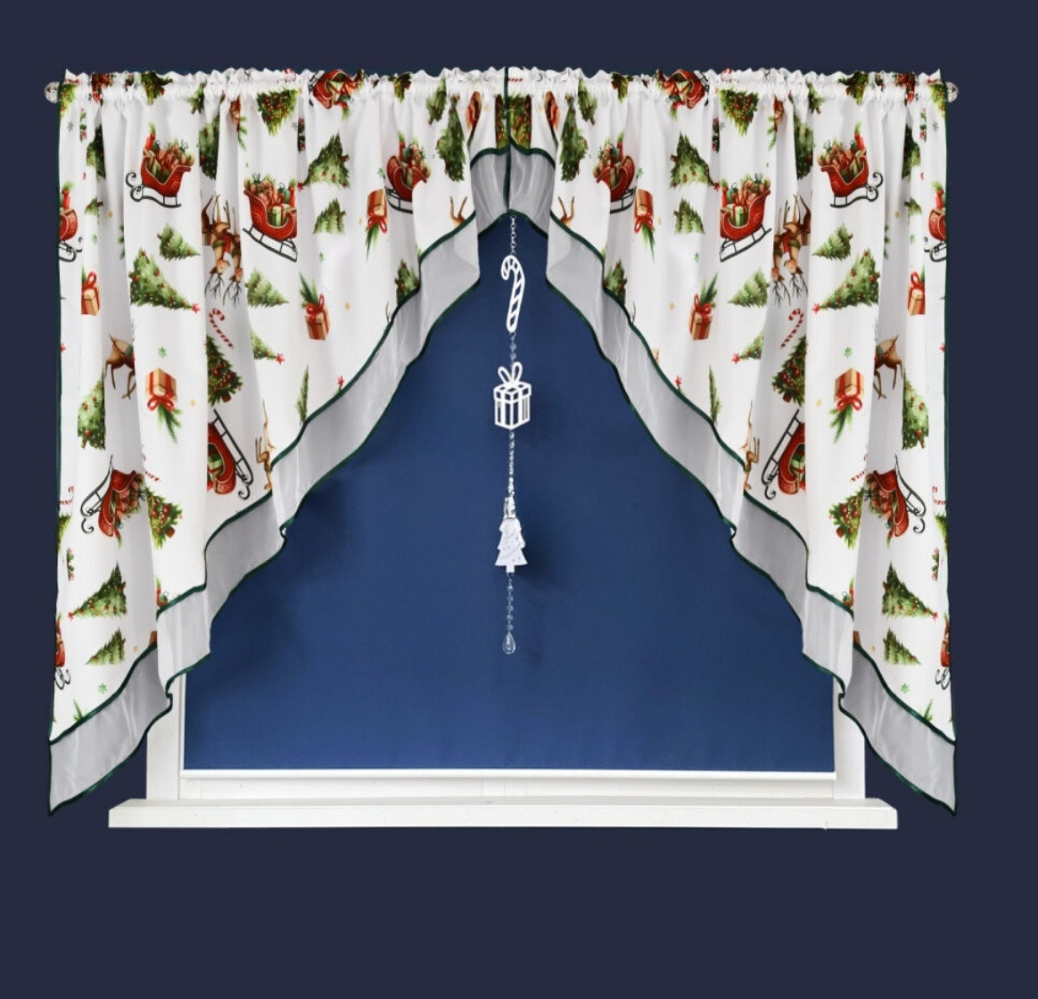 Kvalitní krátký vánoční dekorační závěs v rozměru 400x145 cm, ideální do kuchyně nebo obývacího pokoje. Závěs má našitou řasící pásku s tunýlkem pro zavěšení na garnyž, žabky nebo háčky. 1 kus v balení. Sada obsahuje ažurový přívěsek ve tvaru hole, dárek a vánoční stromeček, vyrobený z plsti. číst celé