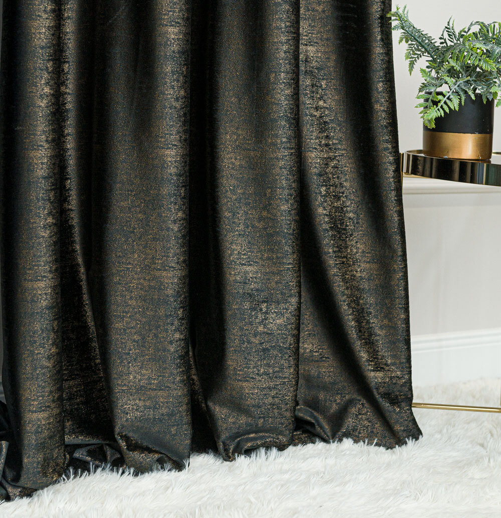 Nádherný hotový dekorační závěs vyrobený v trendovém vzoru a barvách do ložnice nebo obývacího pokoje v rozměru 140x250 cm s kroužky pro tyčovou gárnyž. 1 kus v balení. 210 g/m2. Je vyrobený ze sametové látky s jemným zlatým třpytivým potiskem a představuje kombinaci elegance a modernosti. Závěs má 8 kovových průchodek ve stříbrném chromu.