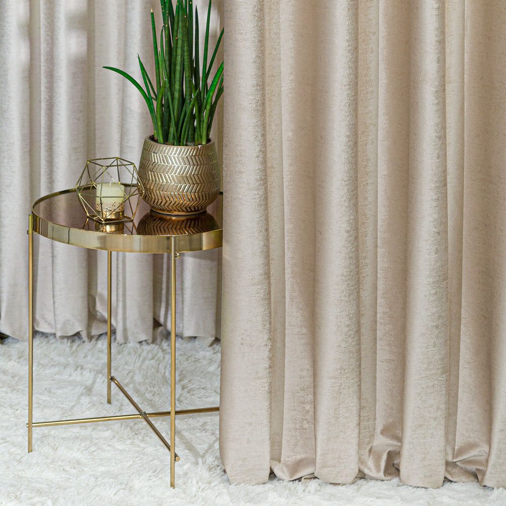 Nádherný hotový dekorační závěs vyrobený v trendovém vzoru a barvách do ložnice nebo obývacího pokoje v rozměru 140x250 cm s kroužky pro tyčovou gárnyž. 1 kus v balení. 210 g/m2. Je vyrobený ze sametové látky s jemným zlatým třpytivým potiskem a představuje kombinaci elegance a modernosti. Závěs má 8 kovových průchodek ve stříbrném chromu.