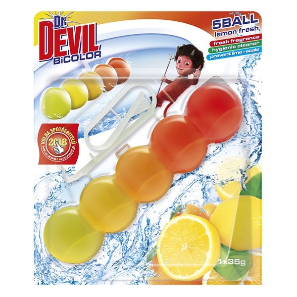 Dr. Devil BiColor - kuličkový gelový závěs do WC - 35gr vůně Lemon Fresh5 Ball BiColor je závěs do toalety ze speciálního gelu, který čistí, voní a preventivně působí proti usazování voního kamene. Aplikace je velmi jednoduchá a zvládne ji opravdu každý. Stačí odstranit z nového závěsu folii a upevnit za kraj toaletní mísy. V případě, že upevníte závěs do hlavního proudu vody, bude jeho účinnost silná. Pokud si přejete prodloužit životnost závěsu, tak ho upevněte na místo, kde není hlavní proud. Před první aplikací se doporučuje toaletní mísu řádně umýt a následně aplikovat závěs, docílíte tak té nejvyšší možné účinnosti.Balení 35Gr NebezpečíH315 : Dráždí kůži.H318 : Způsobuje vážné poškození očí.H412 : Škodlivý pro vodní organismy, s dlouhodobými účinky.
