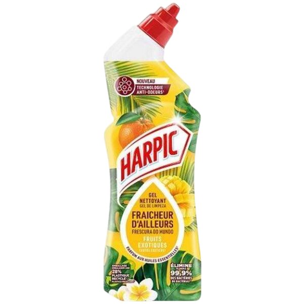 Harpic 750ml gel do WC Exotisch Fruit je praktický WC gel určený pro každodenní hygienu toalety. Díky své gelové konzistenci účinně přilne na stěny záchodové mísy, čistí důkladně až po okraje, likviduje 99,9 % bakterií a zanechává intenzivní exotickou vůni, která prodlouží pocit čistoty v koupelně.