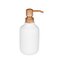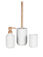Koupelnový set z glazované keramiky v trendových barvách a vzorech. Sestava se skládá z kalíšku na zubní kartáček, dávkovače na mýdlo a toaletní štětky.