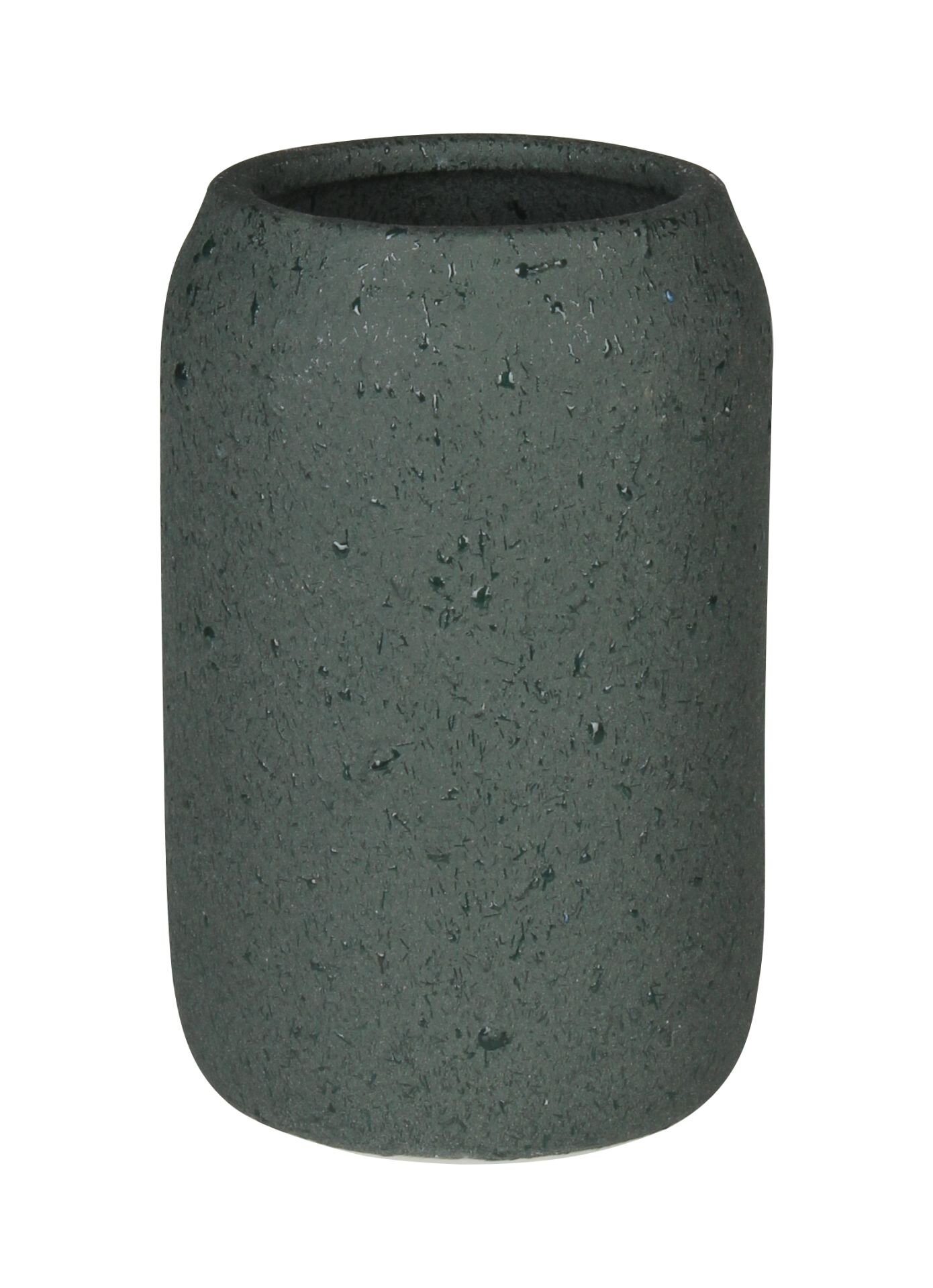 Koupelnový set z glazované keramiky v trendových barvách a vzorech. Sestava se skládá z kalíšku na zubní kartáček, dávkovače na mýdlo a toaletní štětky .