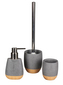 Koupelnový set z glazované keramiky v trendových barvách a vzorech. Sestava se skládá z kalíšku na zubní kartáček, dávkovače na mýdlo, kosmetického zrcátka a toaletní štětky.