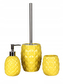 Koupelnový set z glazované keramiky v trendových barvách a vzorech. Sestava se skládá z kalíšku na zubní kartáček, dávkovače na mýdlo a toaletní štětky.
