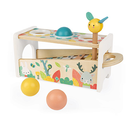 Krásná dřevěná hračka zatloukačka a xylofon v jednom na rozvoj dovednosti ve velmi jemných a moderních barvách s roztomilými dřevními zvířátky. Hračka Vašemu dítěti pomůže rozvíjet obratnost a zároveň si s ní užije i spoustu zábavy. Dvě hry v jednom - kladivem se včeličkou zatlučeme 3 dřevěné barevné kuličky a ty vydávají krásný zvonivý zvuk na klávesách xylofonu a zároveň součástí hračky je samotný odnímatelný xylofon a tak Vaše dítě může hrát kdekoli! Hračka je vhodná pro děti od 12 mesiacov.Rozmer: 29 , 1 x 12 x 13 cm