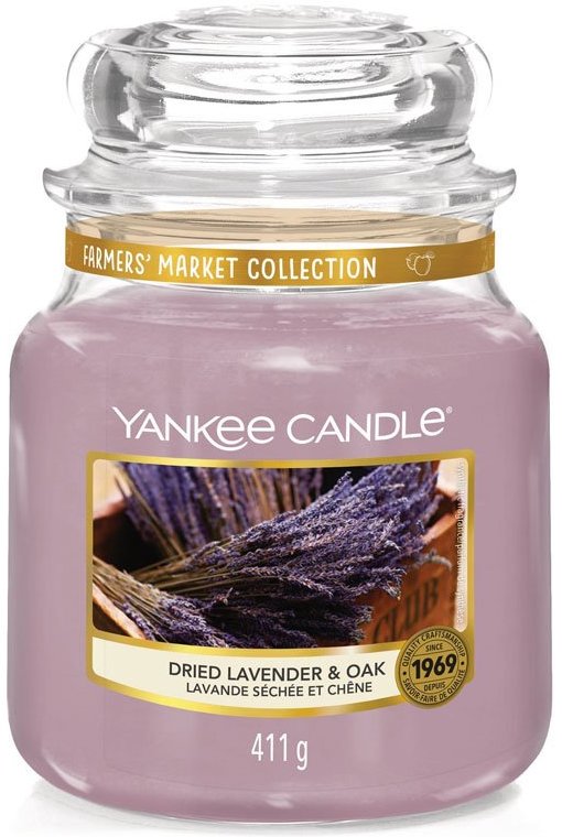 Klasický a nejoblíbenější design svíček Yankee Candle se skleněným víčkem. Svíčky jsou vyrobeny za použití nejlepších surovin, včetně čistých přírodních vonných výtažků. Rovnoměrně a zcela provoněný parafín v potravinové kvalitě. Každý knot je ručně narovnán a zcela vyhoří. Yankee Candle Dried Lavender & Oak - (Sušená levandule a dub) - ručně svázaná kytička levandule s dřevitou a kořeněnou vůní farmářského trhu.
