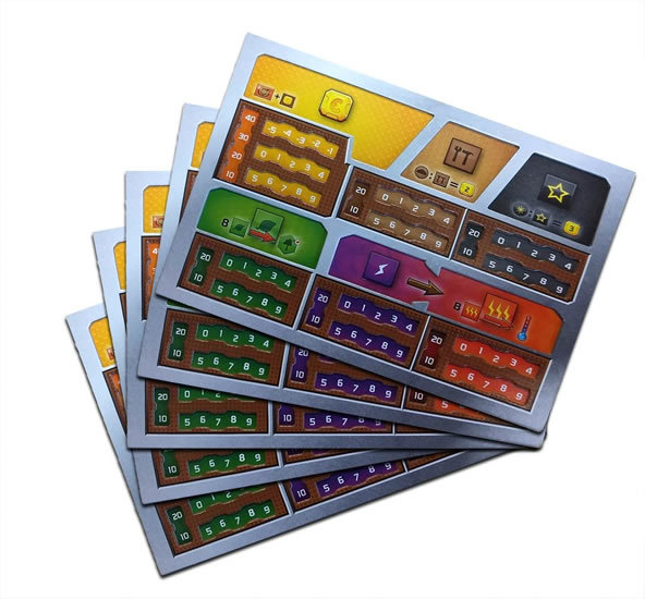 Vylepšené desky jsou něčím, co ocení každý hráč, který si jednou zahrál Mars: Teraformaci. Už žádné kostičky, které se libovolně přesouvají mezi kolonkami! Vše má pěkně svůj chlívek a když drknete do stolu, vážně se nic nestane. Desky jsou masivní z několikavrstvého kartonu a v balení jich je pět.
