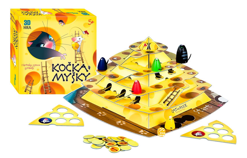 Kočka díry v sýru sčítá, mnoho děr, a tak přemítá: „Tady zřejmě myši řádí, když pánův sýr pojídají. Musím já sýr ohlídat, myši všechny odehnat.” Myšky pozor na kočičku! Shodit vás chce ze sýra. K vrcholu si pospěšte! Všechen sýr si odneste! Kdo sýr před pastmi ochrání a vítězství své obhájí? 3D hra Kočka a myšky: Nástrahy sýrové pyramidy je hra o postup. Tato hra je zajímavá využíváním trojrozměrného prostorového skládání, to umožní aby se hrálo nikoliv na ploše, ale v 3D prostoru pyramidy. Díky třetímu rozměru je hra mnohem zajímavější a zábavnější. Při sestavování pyramidy dítě trénuje své konstrukční schopnosti, ve hře se seznamuje s čísly, poznává základy počtů. Hra rozvíjí jemnou motoriku rukou. Tato hra je zajímavá nejen pro děti, ale také pro jejich rodiče! Cílem hry je prvním se vyšplhat na vrchol sýrové pyramidy a získat přitom co největší počet bodů na kouskách sýru. Nebude to však snadné! Neopatrné myšky se můžou propadnout skrze pyramidu zpět a nebo být sežrány nebo shozeny mlsnou kočkou. Hra obsahuje kartonovou stavebnici pyramidy, plátky a žetony, dřevěné figurky myšek a kočky, skleněné kuličky a vrhací kostku. Počet hráčů: 2 - 4 Věková skupina: od 5 do 99