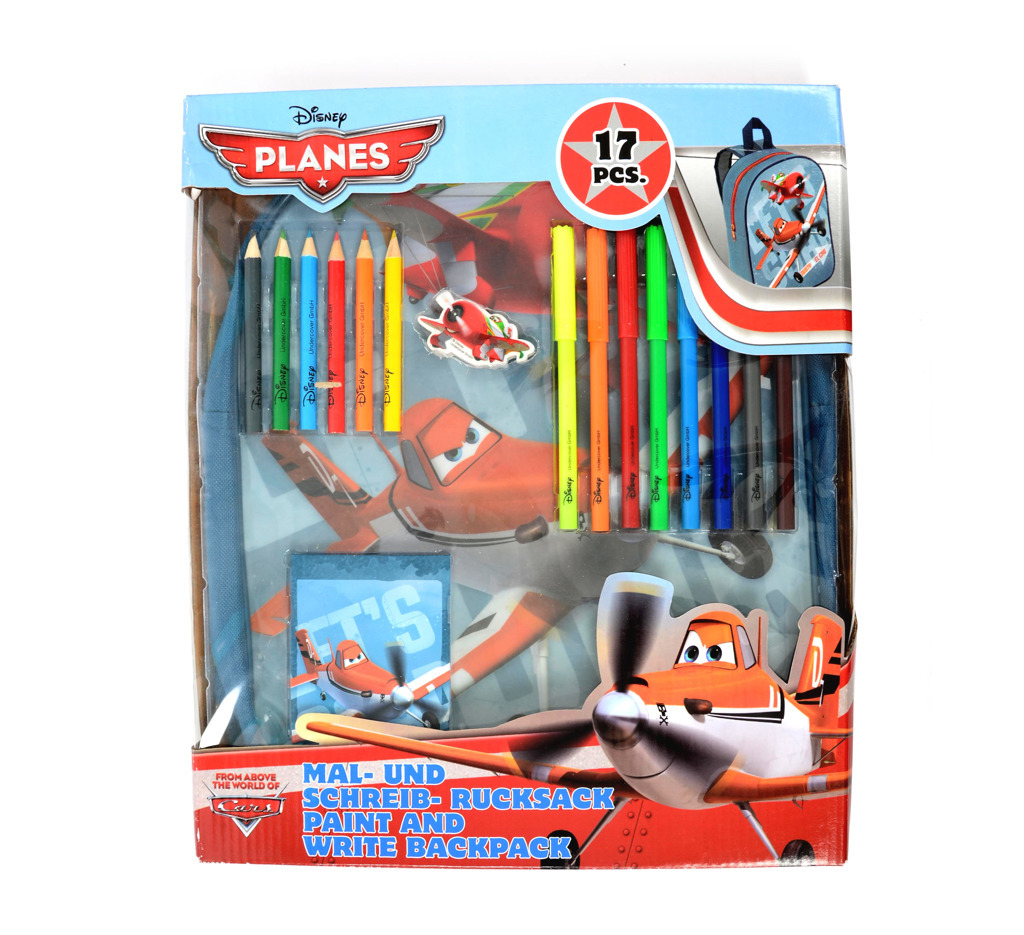 Sada obsahuje 6 základních barev ořezaných pastelek, gumu na gumování, 8 základních barev fixů, notýsek na psaní a malování a praktický batoh s motivem „planes“ pro uložení všech věcí.