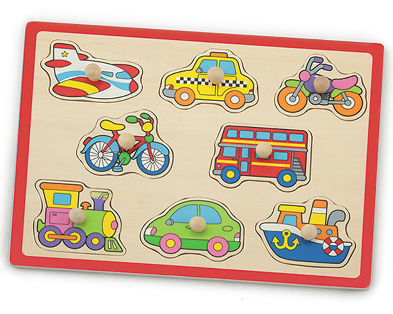 Nádherné dřevěné vkládací puzzle, které mě okouzlily moc krásnými obrázky dopravních prostředků - kolo, taxík, letadlo, motorka, loď, autíčko, vláček, všechny tyto prostředky zde malé dítko najde a může se je pokusit vložit na správné místo do dřevěné desky. Každý tvar obsahuje praktickou dřevěnou úchytku, za kterou děti tvar chytí a velice snadno ho umístí na volné místečko, hračku moc doporučuji, je skvělá.