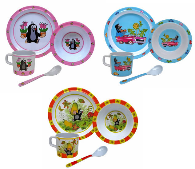 Krásné nádobí s motivy oblíbené pohádkové postavy a to Krtečka. Tohle nádobí se moc povedlo, obsahuje základní nádobí pro děti, a to talířek plítký, hluboký, hrníček a lžičku. Je kvalitně vyrobené, snadno udržitelné, obrázky stále drží, i když jej používáme hodně dlouho. Máme různé motivy pro holčičky i kluky, vybere si jistě každý, pokud vy nebo Vaše děti milují krtečka, tak tahle sada by neměla chybět.
