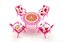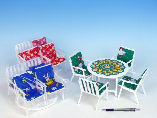 Nábytek pro panenky stůl + 4 židle se sedáky 4 barvy (1 sada v sáčku)
