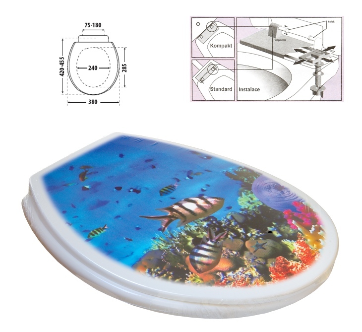 WC deska, sedátko nebo chcete-li prkénko s krásným potiskem ryby moře vám zaručeně zpříjemní pobyt na toaletě. Sedátko je kompatibilní se širokou škálou standardních modelů toaletních mís od různých výrobců. Uchycení WC sedátka lze nastavit pomocí nastavitelných pantů. Materiál: kvalitní plast. Rozměry viz obrázek. V nabídce naleznete i další výrobky ve stejném designu.