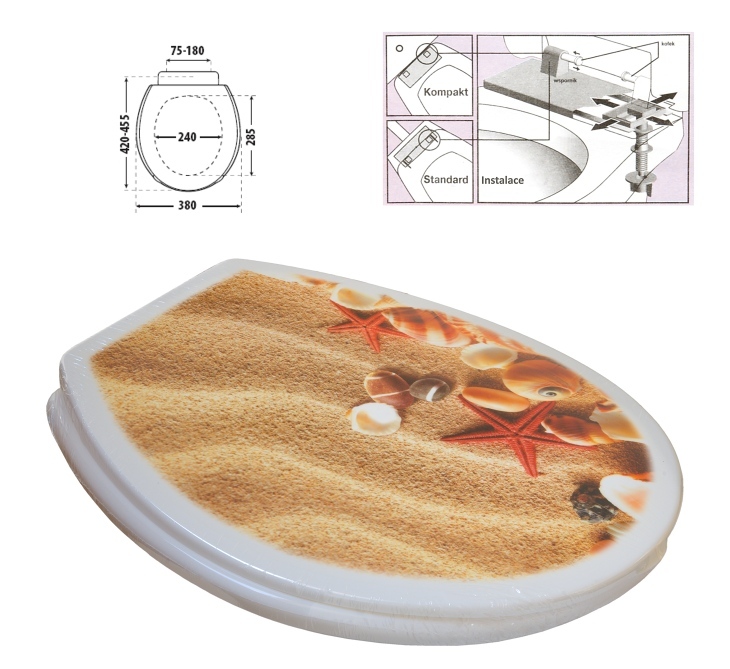 WC deska, sedátko nebo chcete-li prkénko s krásným potiskem hvězdice a písek vám zaručeně zpříjemní pobyt na toaletě. Sedátko je kompatibilní se širokou škálou standardních modelů toaletních mís od různých výrobců. Uchycení WC sedátka lze nastavit pomocí nastavitelných pantů. Materiál: kvalitní...