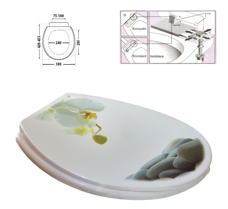 WC deska, sedátko nebo chcete-li prkénko s krásným potiskem orchidej vám zaručeně zpříjemní pobyt na toaletě. Sedátko je kompatibilní se širokou škálou standardních modelů toaletních mís od různých výrobců. Uchycení WC sedátka lze nastavit pomocí nastavitelných pantů. Materiál: kvalitní plast. Rozměry viz obrázek. V nabídce naleznete i další výrobky ve stejném designu.