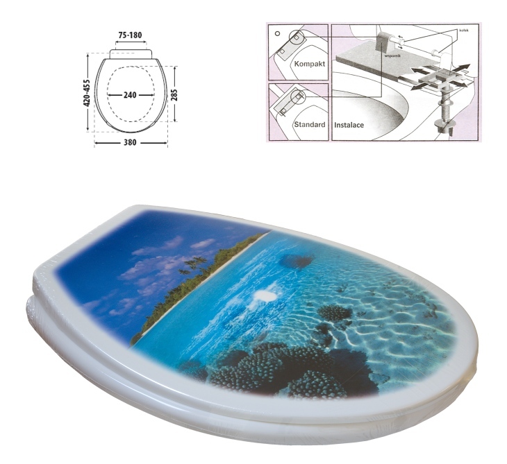 WC deska, sedátko nebo chcete-li prkénko s krásným potiskem moře ostrov vám zaručeně zpříjemní pobyt na toaletě. Sedátko je kompatibilní se širokou škálou standardních modelů toaletních mís od různých výrobců. Uchycení WC sedátka lze nastavit pomocí nastavitelných pantů. Materiál: kvalitní plast....