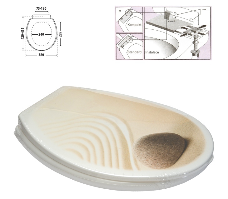 WC deska, sedátko nebo chcete-li prkénkno s krásným potiskem kameny vám zaručeně zpříjemní pobyt na toaletě. Sedátko je kompatibilní se širokou škálou standardních modelů toaletních mís od různých výrobců. Uchycení WC sedátka lze nastavit pomocí nastavitelných pantů. Materiál: kvalitní plast. Rozměry viz obrázek. V nabídce naleznete i další výrobky ve stejném designu.