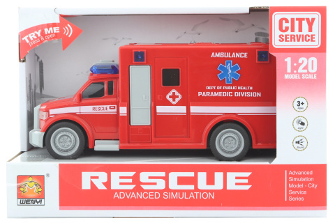 Plastová sanitka na baterie. Auto po stisknutí tlačítek na střeše svítí a vydává zvuky. Má otevírací dveře. Napájení na 3 AG13 baterie (jsou součástí. Rozměry auta cca 19 x 9 x 7 cm. Rozměry balení cca 23,5 x 15,5 x 10,5 cm. Věk 3+ číst celé