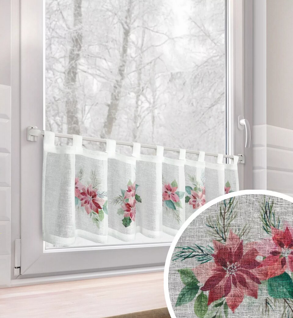 Kvalitní vitrážová záclona ze zimním vzorem. Hotová dekorační vitrážová záclona s moderním motivem je ideální na zavěšení do kuchyně. Vitrážová záclona má poutka na tyčovou gárnyž.